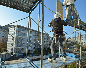 咲輝(ショウキ)では、公共施設やオフィスビル アパート・マンションなどの 建設現場で使用する足場工事を行います。